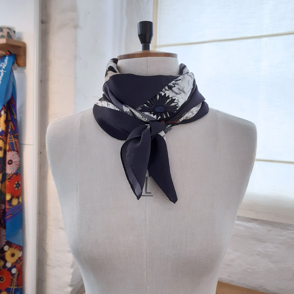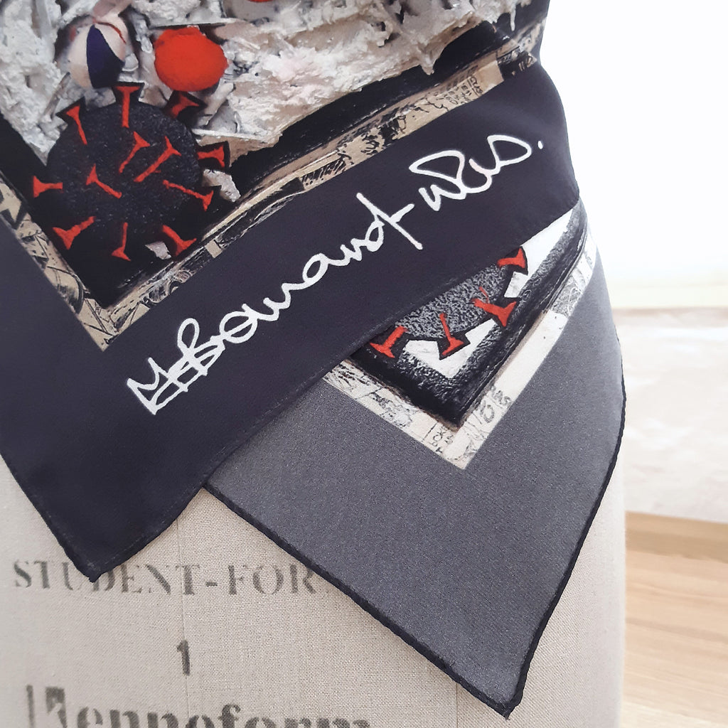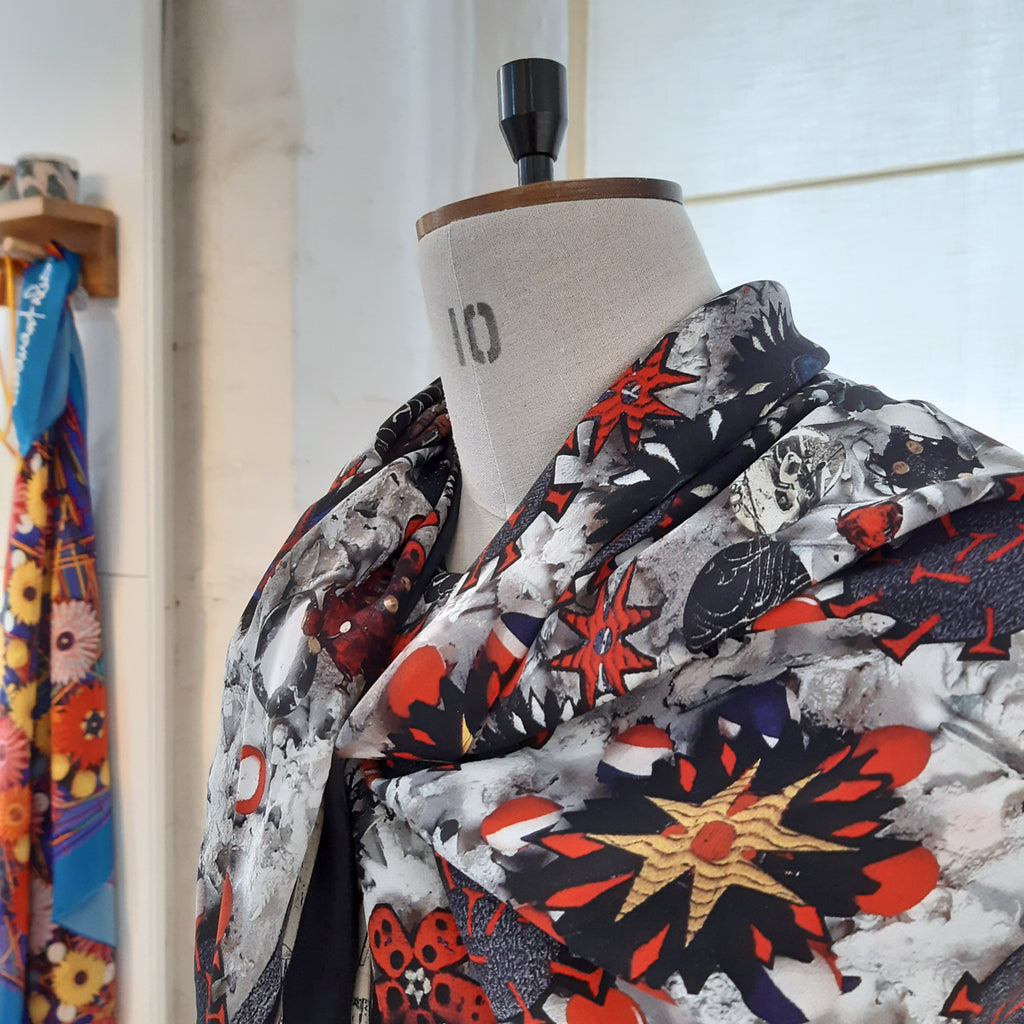 A stunning statement silk scarf featuring a printed design based on Michael's constructed textile artwork, 'Pretty Deadly'.