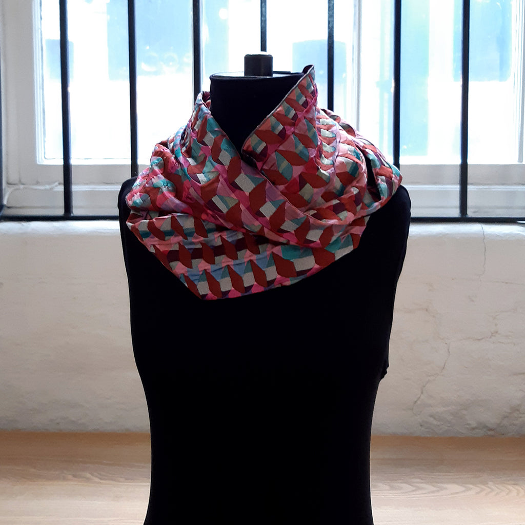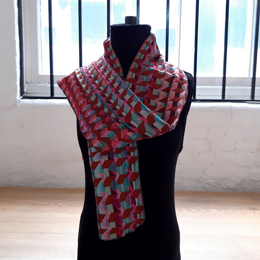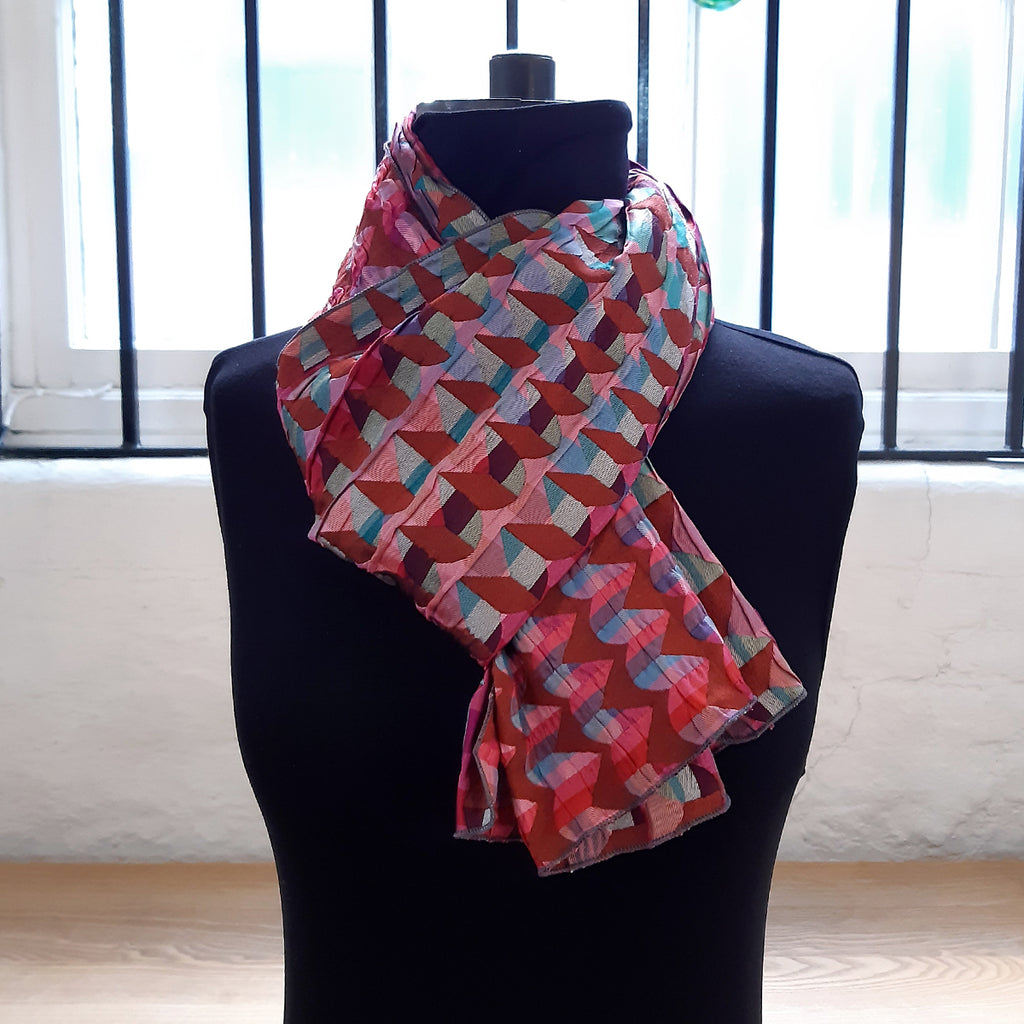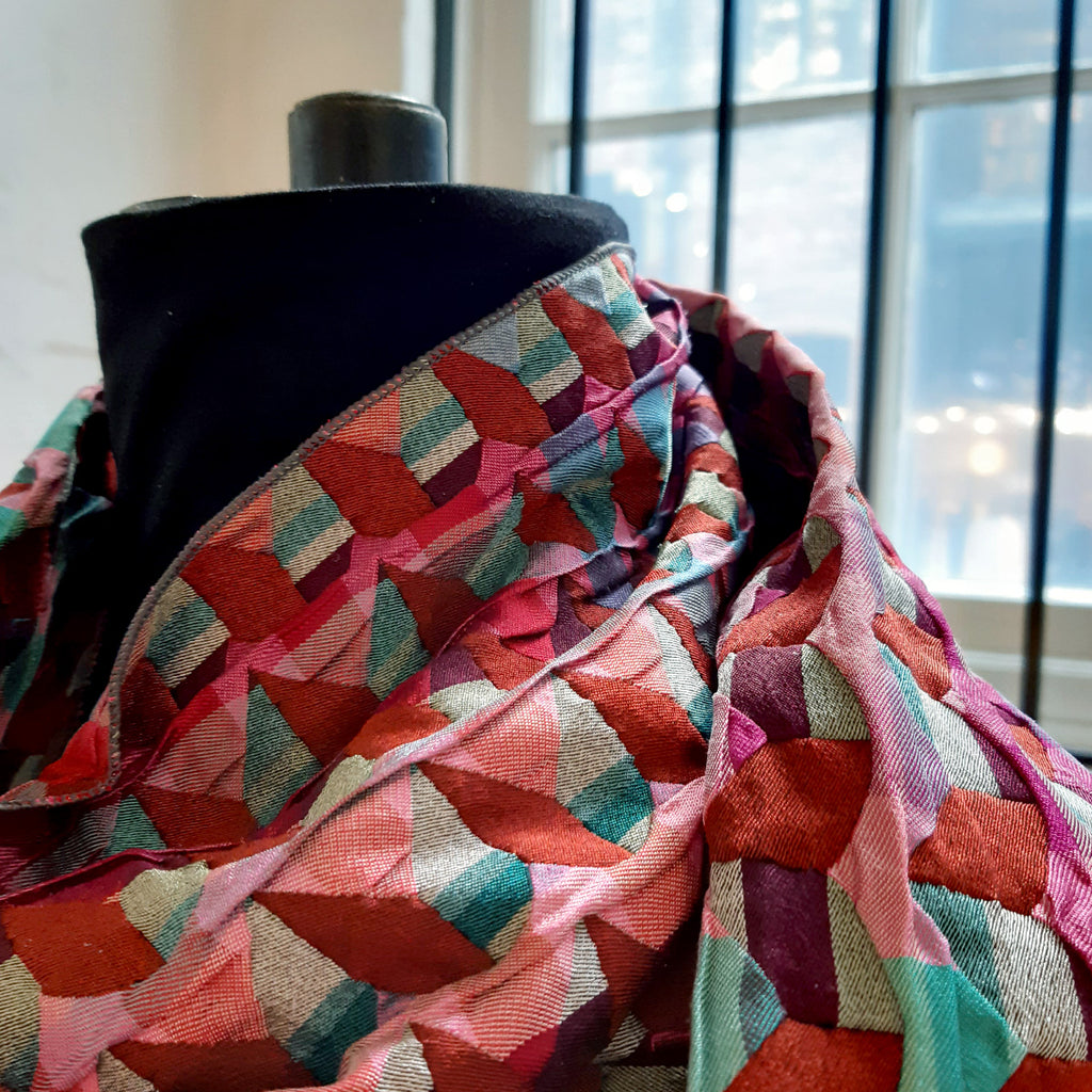 This scarf is woven from silk and lycra yarns in a double cloth structure to create a unique three-dimensional textural quality.