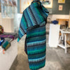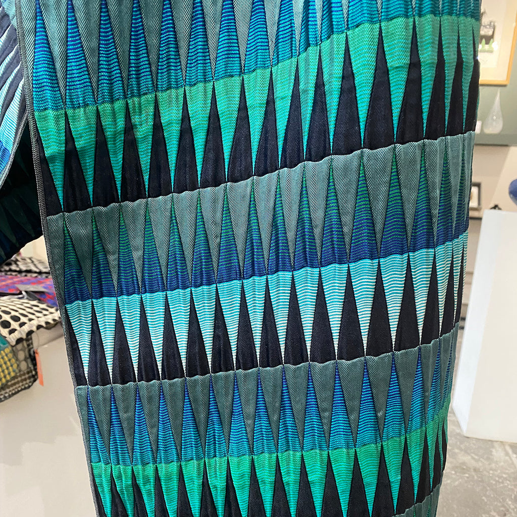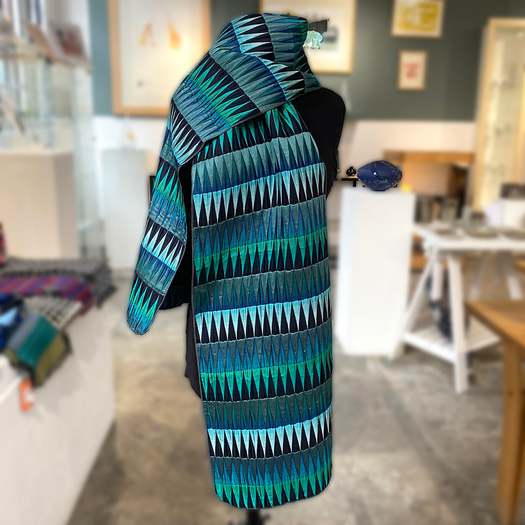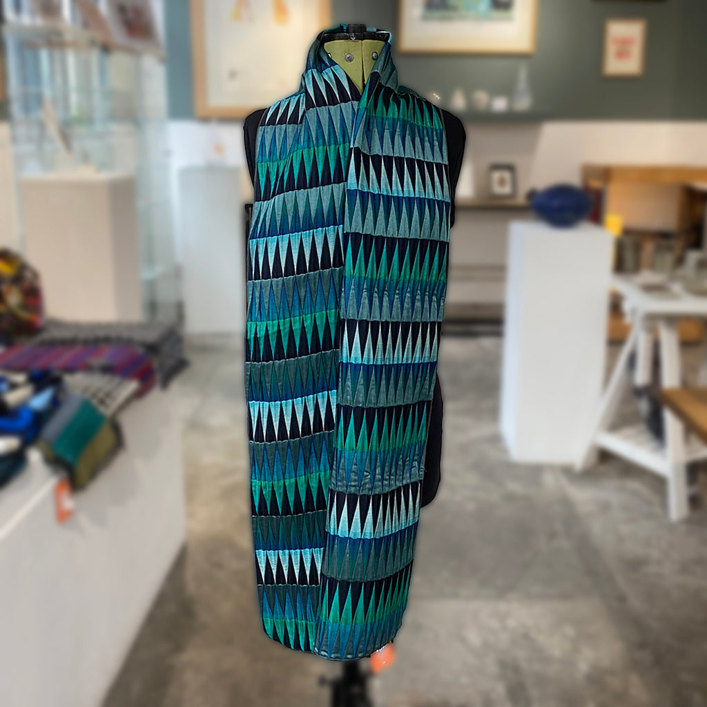 The jewel coloured, triangular design of Isla creates a 3-dimensional quality due to the double-weave production technique. Margo has been experimenting and developing this process of weaving with silk for over 23 years.