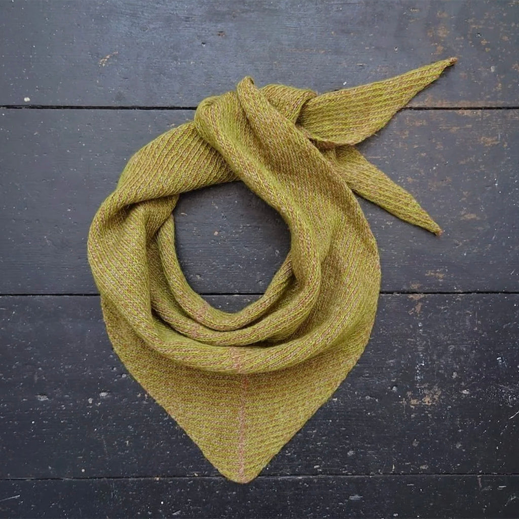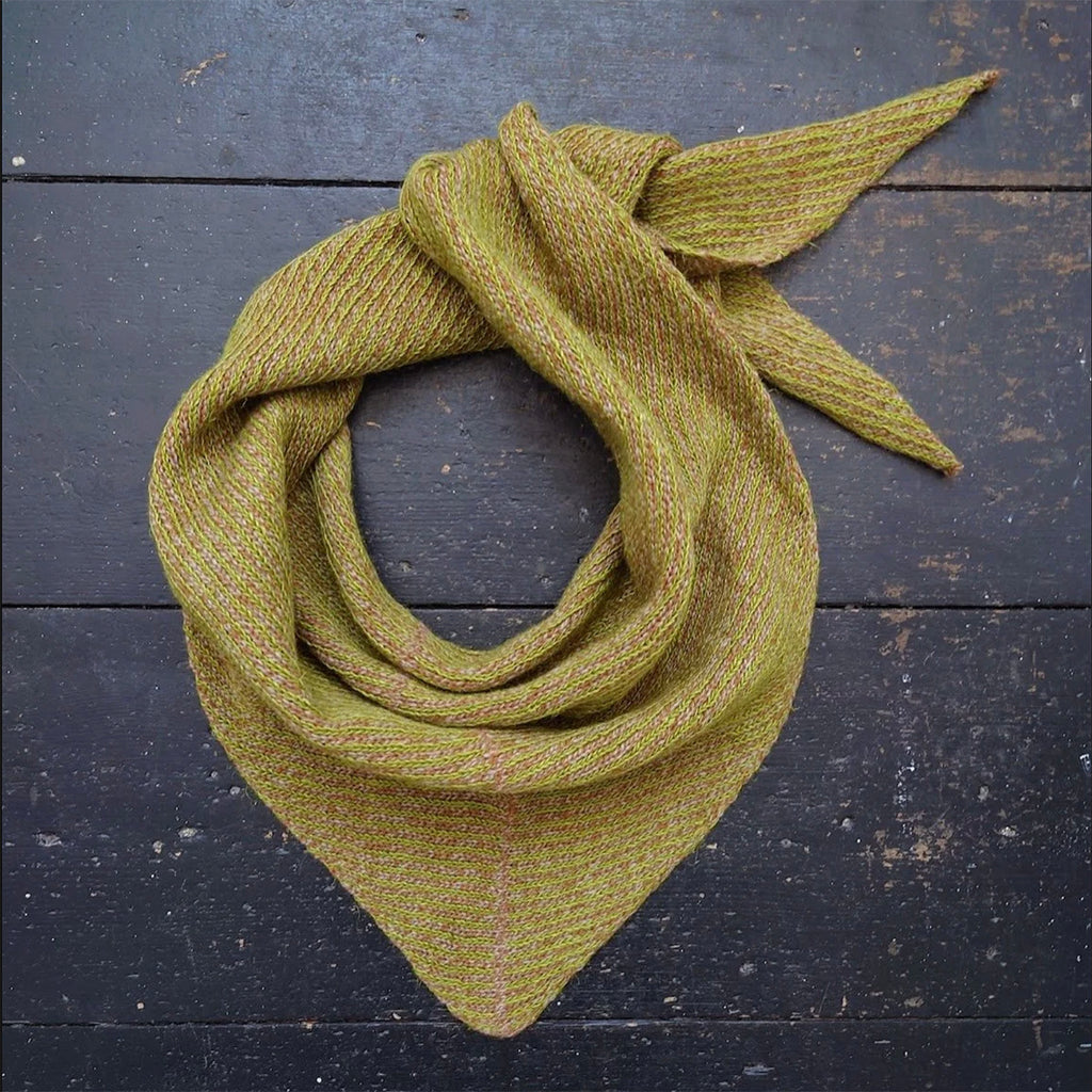 Perfect all year round, this soft and lightweight triangular scarf features a fine stripe pattern combining lime green linen and ginger marl finest lambswool. The linen provides lightness and a beautiful drape to the scarf, while the lambswool adds cosy softness.