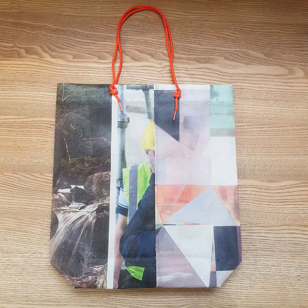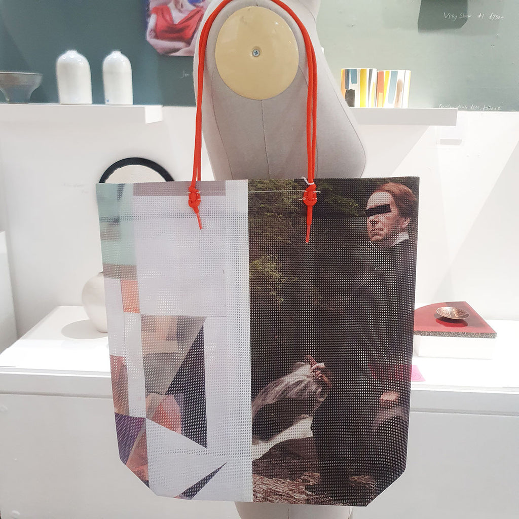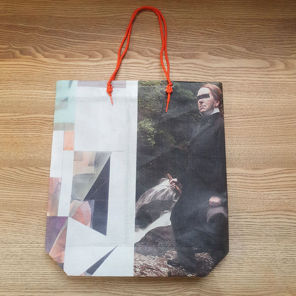 Shopper bag made from an eclectic mix of repurposed materials, including plastic, vinyl, PVC, shoe laces and cotton thread.