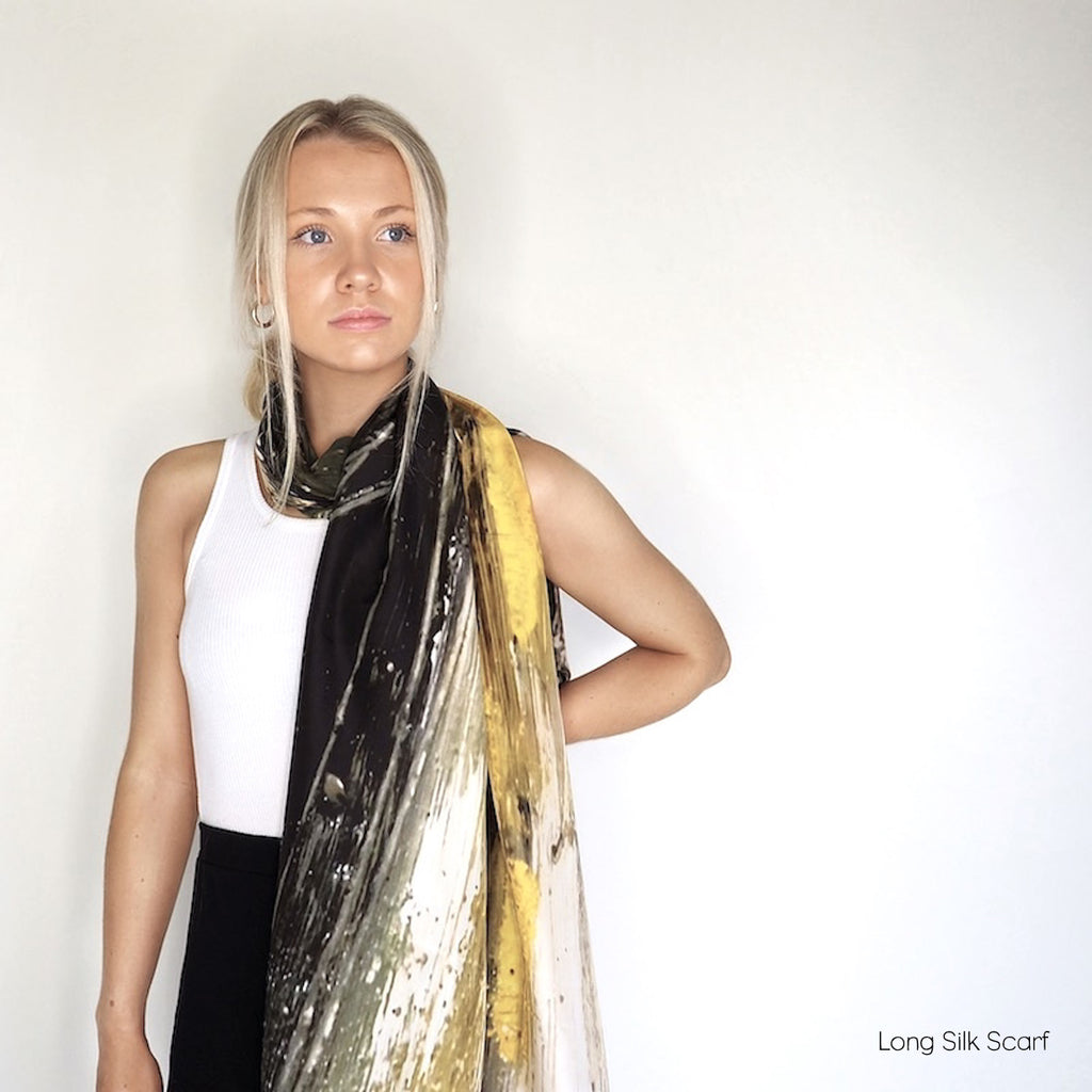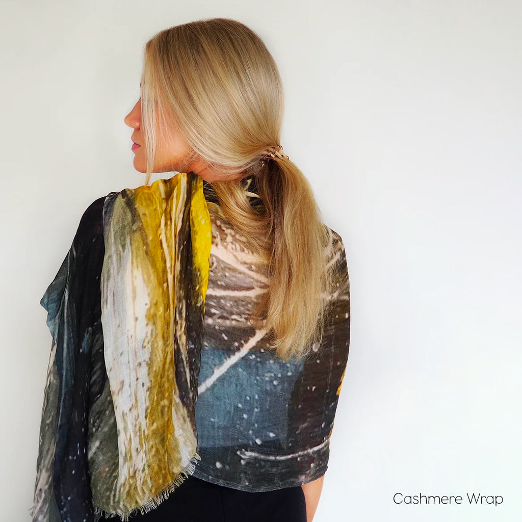Silk and cashmere scarves printed from the 'Moorland' paintings series. These scarves are ethically produced and created using environmentally considerate dyes and natural materials.