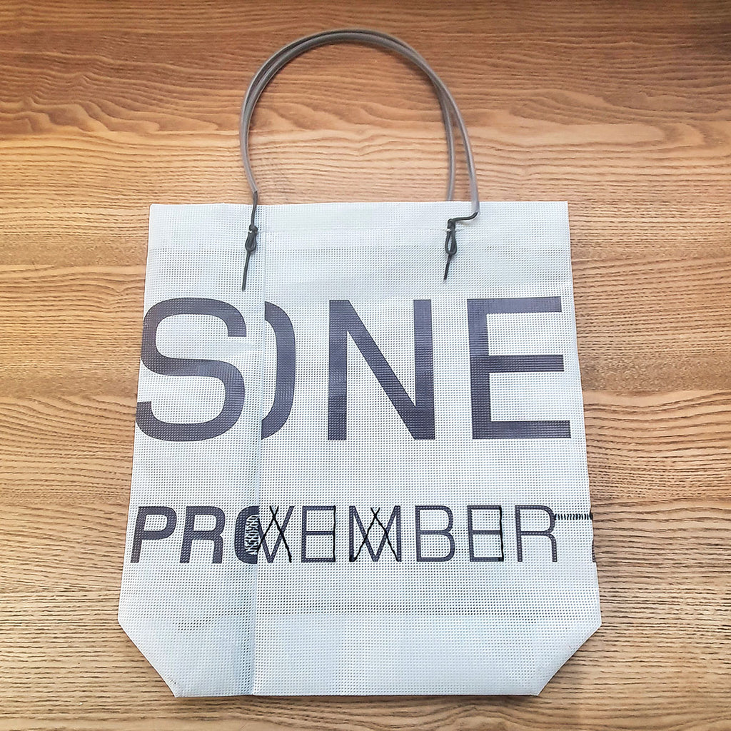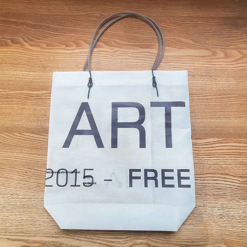 Shopper bag made from an eclectic mix of repurposed materials, including plastic, vinyl, PVC, shoe laces and cotton thread.