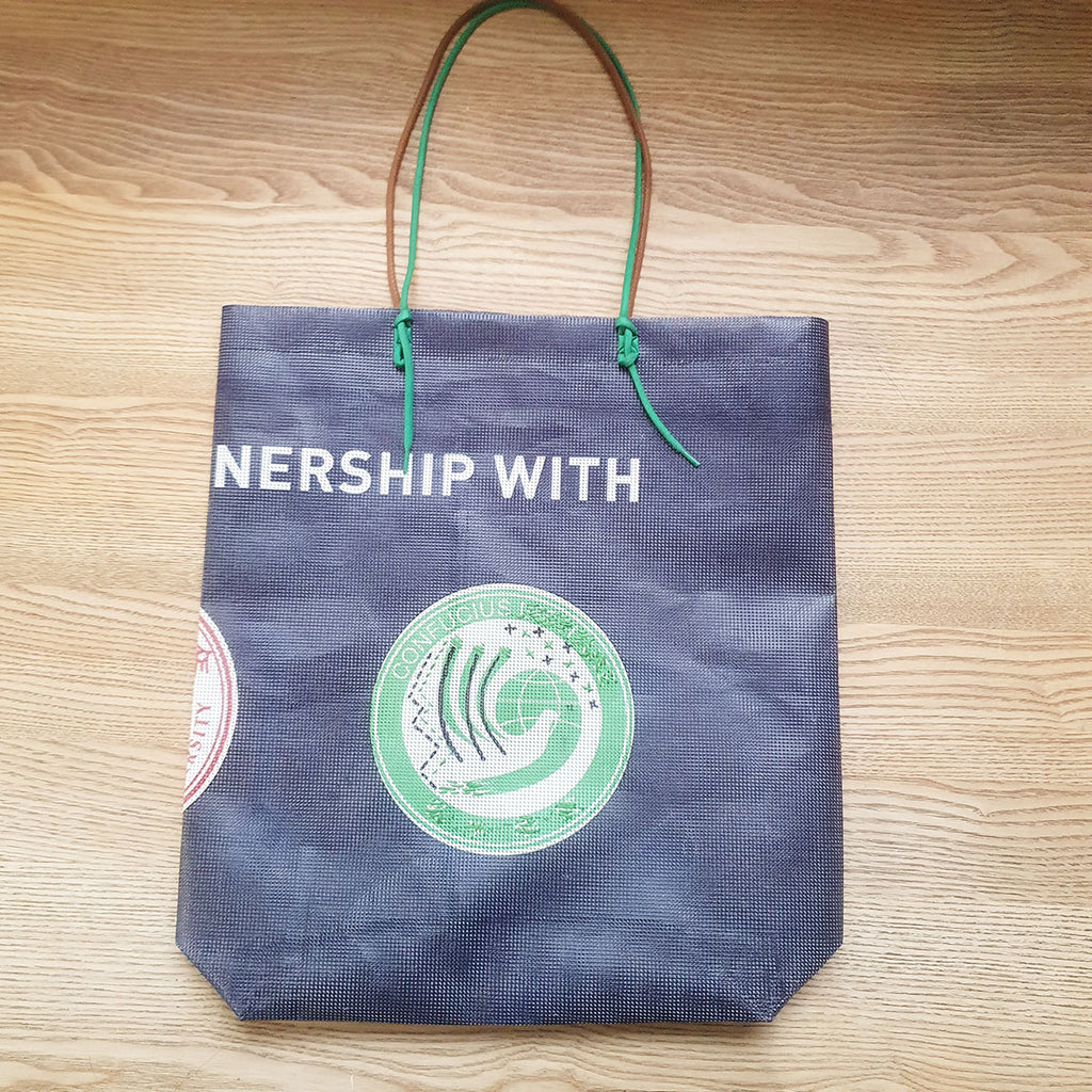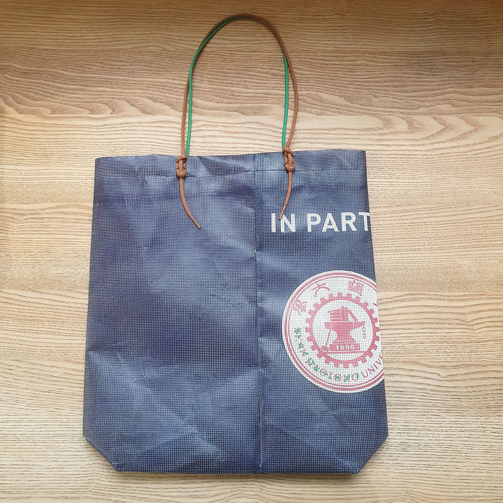 Shopper bag made from an eclectic mix of repurposed materials, including plastic, vinyl, PVC, shoe laces and cotton thread.