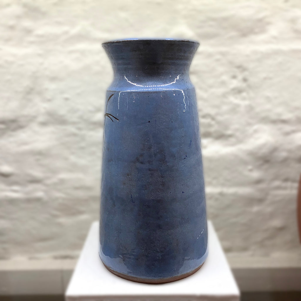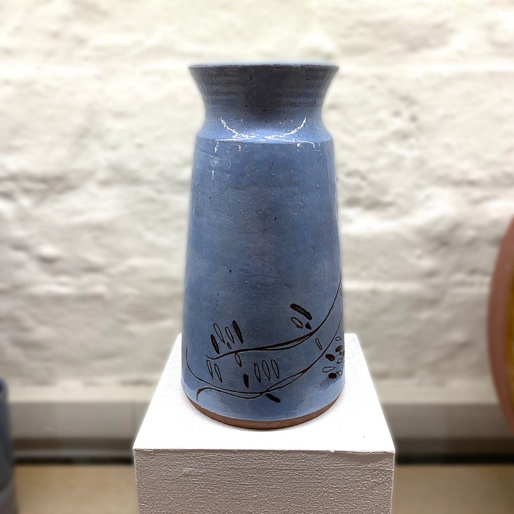 A timeless ceramic carafe, decorated with a blue glaze and incised with Vallari's distinctive, free-hand sgraffito mark-making.