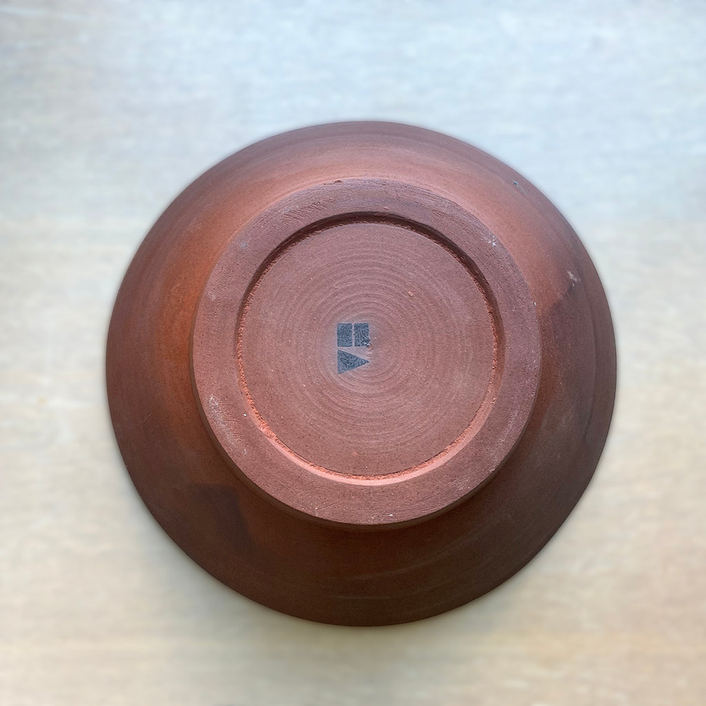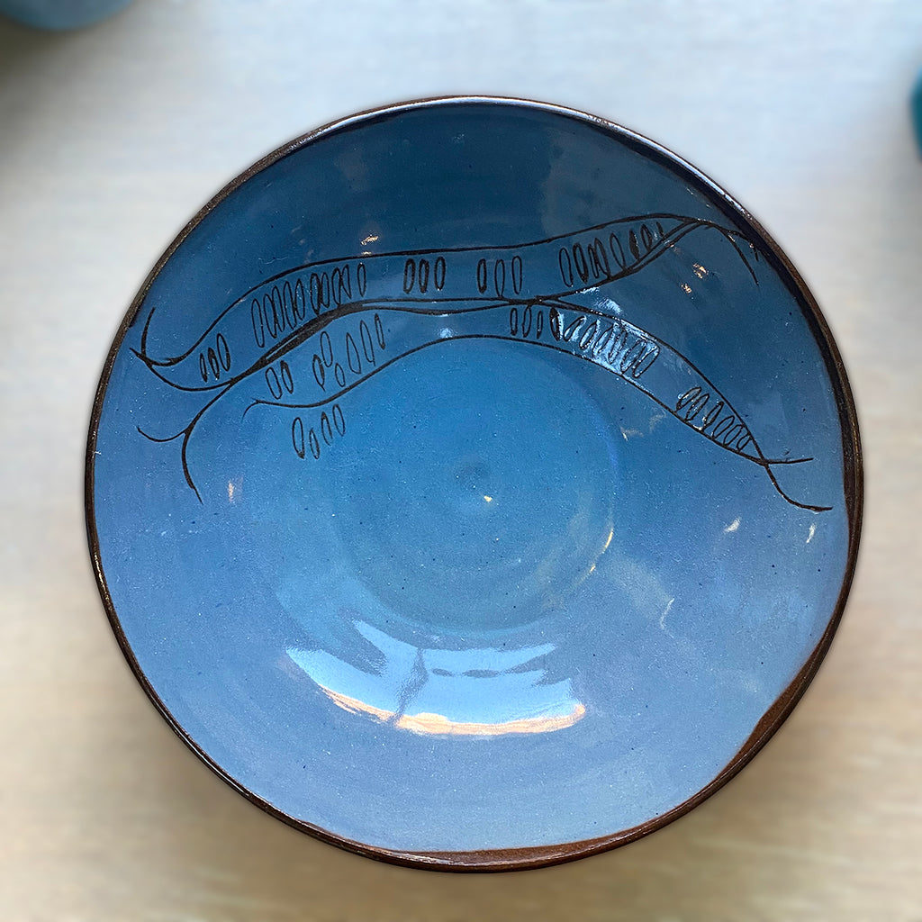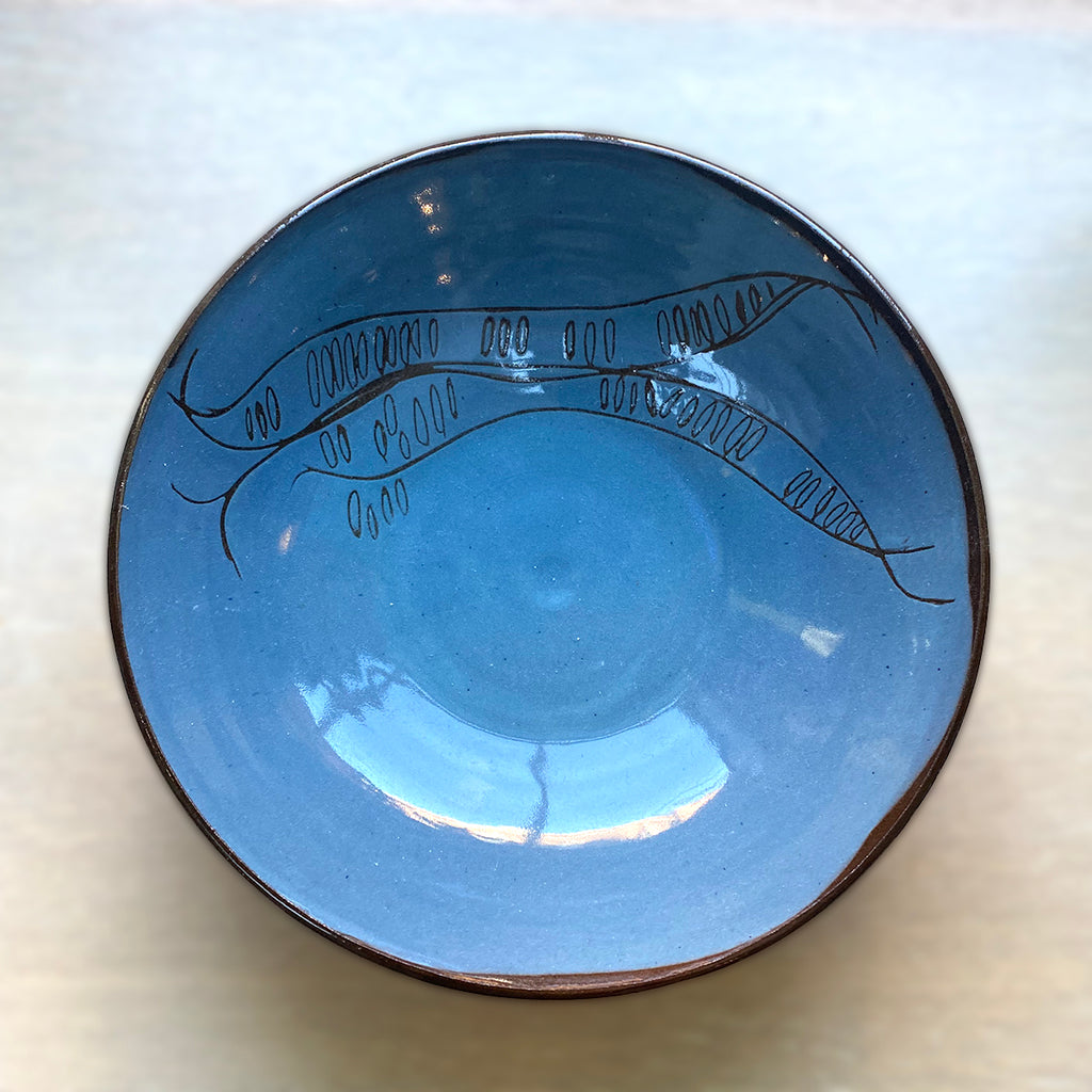 A timeless ceramic bowl, decorated with a blue/grey and incised with Vallari's distinctive, free-hand seedpod illustrations.