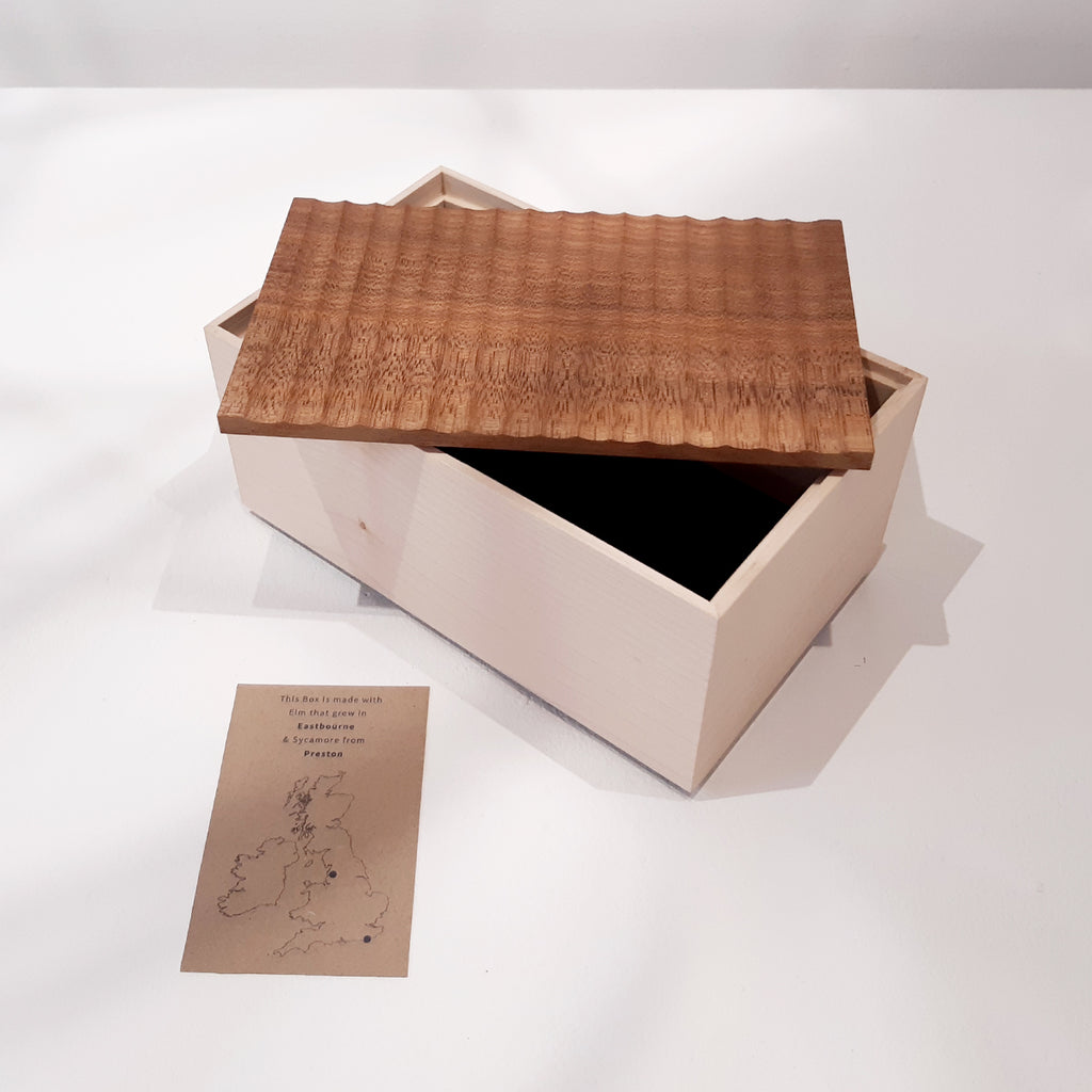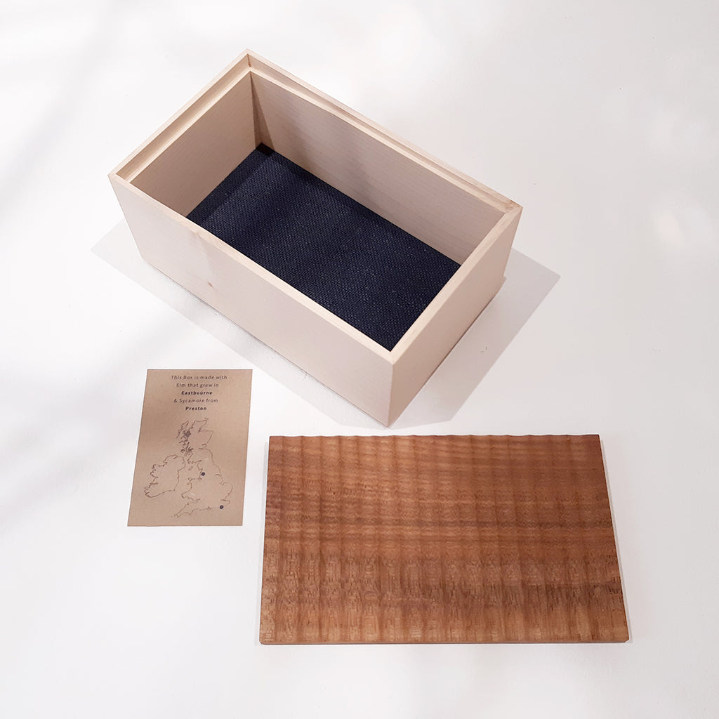 A handcrafted box made with Elm that grew in Eastbourne and Sycamore from Preston. The interior of the box is lined with dark blue linen and the base is cushioned with cork.